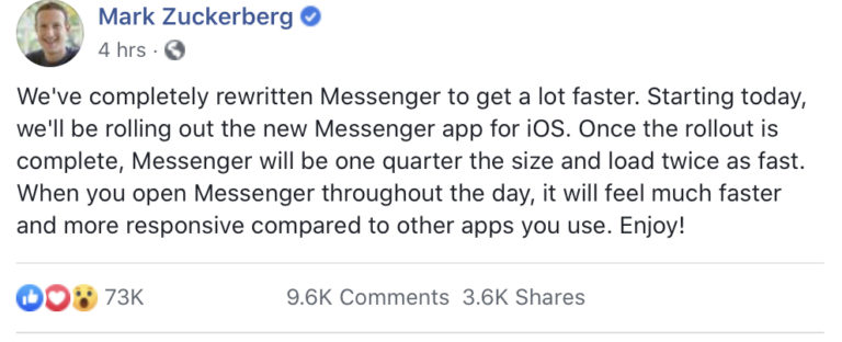 關(guān)于Facebook的最新資訊:Facebook將會(huì)對(duì)Messenger進(jìn)行架構(gòu)優(yōu)化,壓縮應(yīng)用程序大小,相比之前,其訪問速度會(huì)提高到原來的兩倍,因?yàn)楦?,Messenger中的某些功能將暫時(shí)不可用,有些選項(xiàng)卡也會(huì)被移除,但通過搜索還是可以找到。 Facebook首席執(zhí)行官馬克·扎克伯格(Mark Zuckerberg)也在社交平臺(tái)上表示,與其他用戶使用的應(yīng)用程序相比,其速度和響應(yīng)能力將明顯提升!