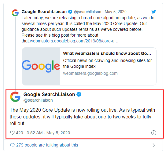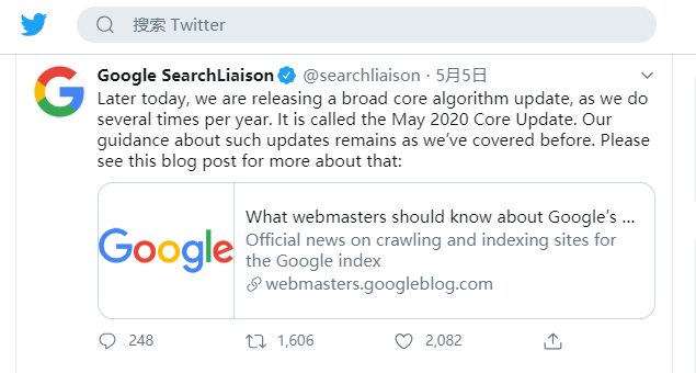 谷歌的官方發(fā)言人,丹尼·沙利文(Danny Sullivan)5月4日在Twitter上明確表示:谷歌在5月4日正式啟動(dòng)了這次的算法更新。并命名為:2020年5月核心更新。