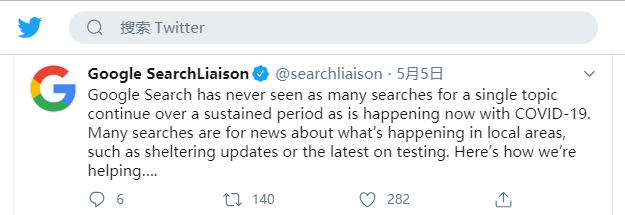 谷歌也表示:谷歌搜索從未見過像COVID-19這樣,對單個(gè)主題的搜索持續(xù)時(shí)間如此之長。許多搜索都是有關(guān)本地正在發(fā)生的新聞,比如最新的消息和最新的測試結(jié)果等。也就是說,疫情已經(jīng)改變了人們的搜索習(xí)慣以及需求。
