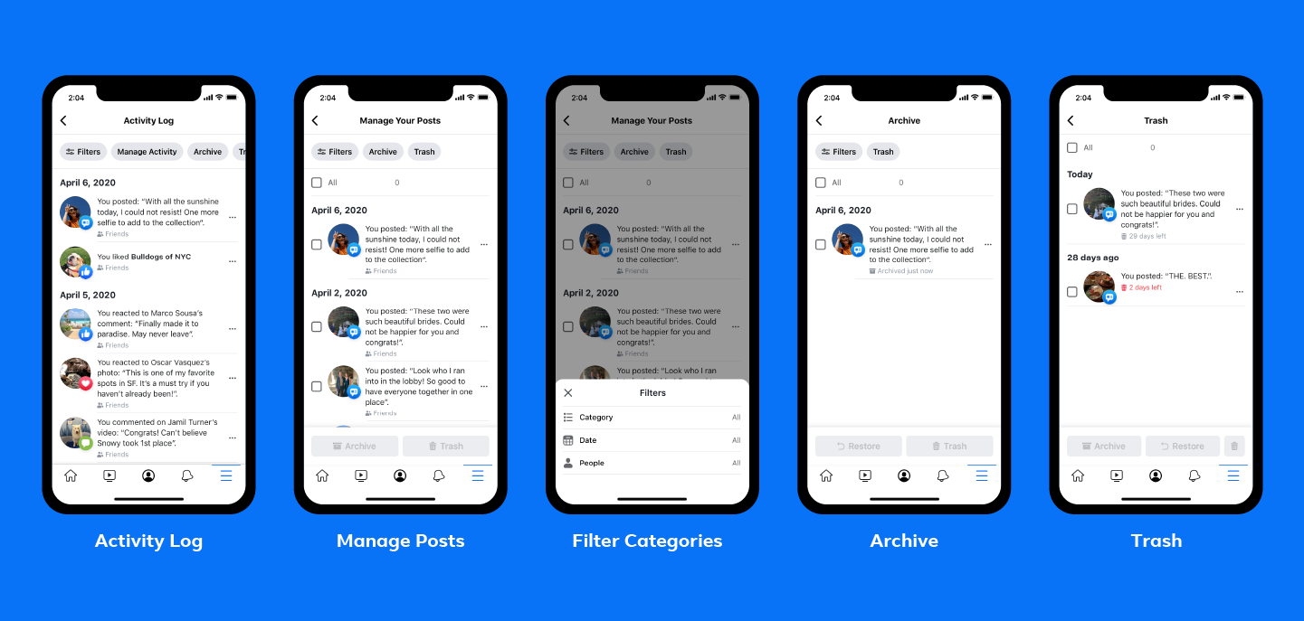 以前,如果用戶想要清理其Facebook個(gè)人資料上的內(nèi)容,則必須一次性調(diào)整每個(gè)帖子的設(shè)置?!肮芾砘顒?dòng)”功能具有內(nèi)置的過濾器,可幫助用戶更快地排序和查找歷史內(nèi)容。