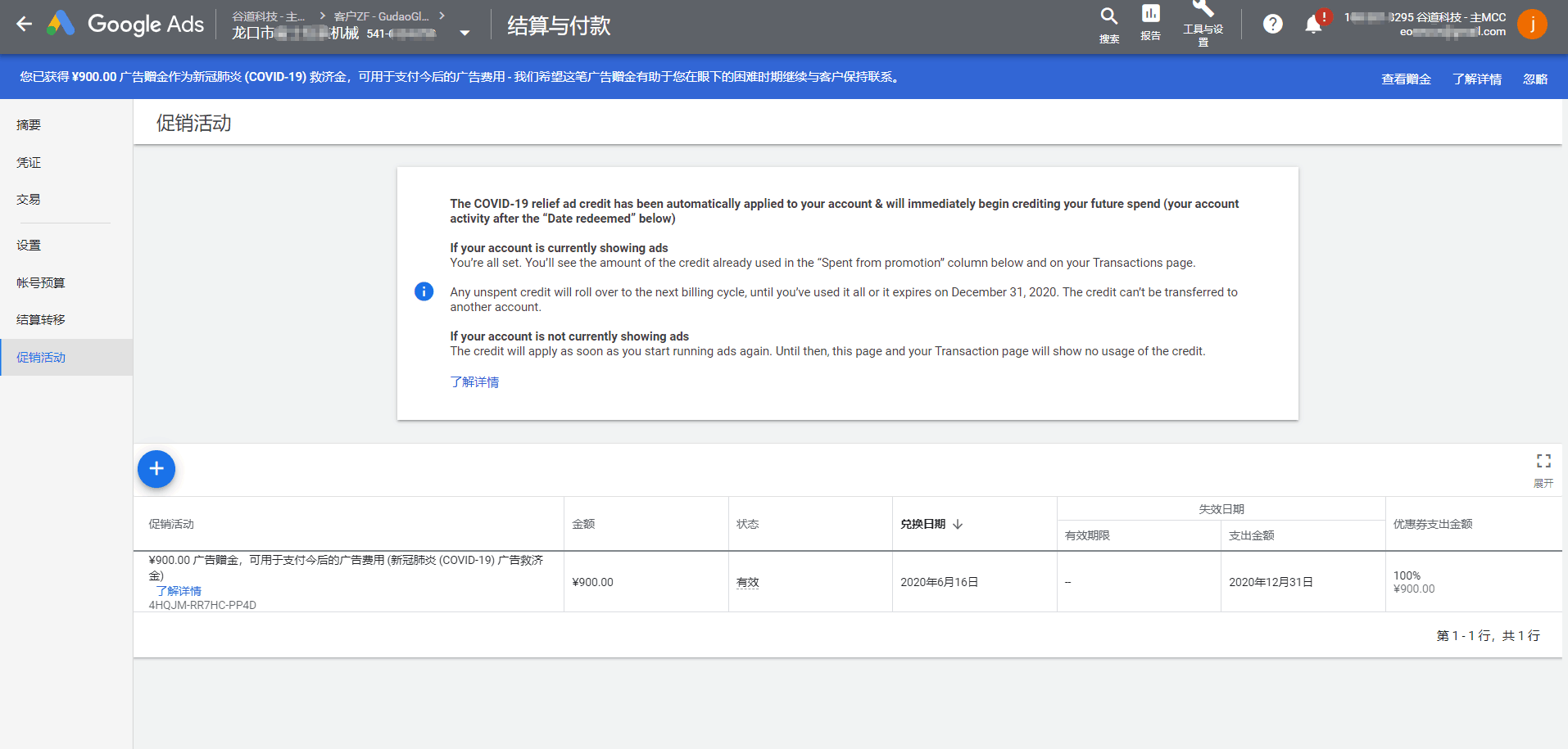 如下圖,則是全球搜廣告投放客戶獲贈了900RMB的救濟(jì)金,已作為廣告費(fèi)支出。