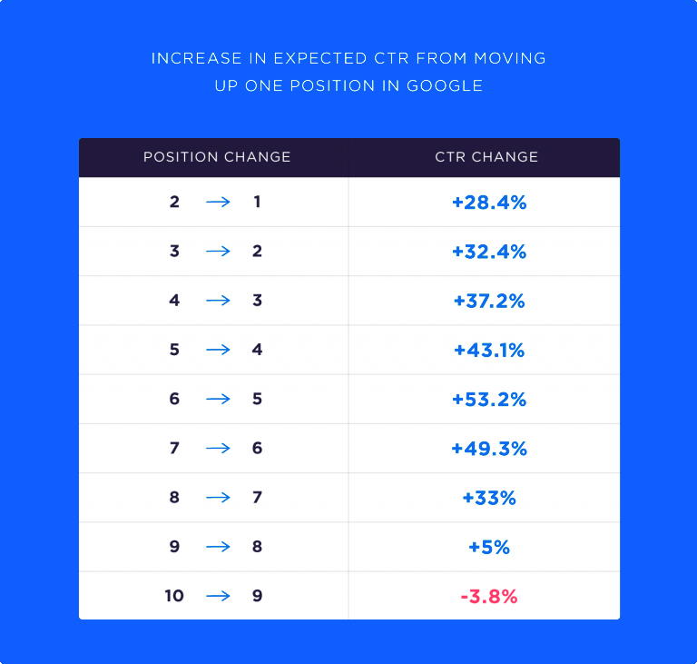 但是,這種點擊率提升并不均勻,會有很大的差異。在SERP中向上移動對點擊率的影響因位置而異。
