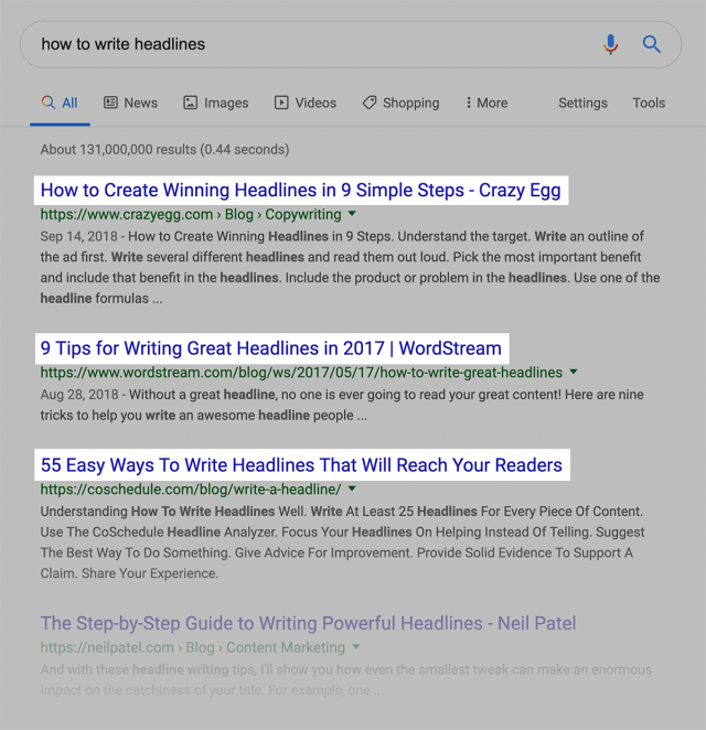 我們的數(shù)據(jù)發(fā)現(xiàn),帶有這些”強勢詞“的點擊率實際上降低了13.9%。一般來說,谷歌搜索結(jié)果中,自然排名前三,都是一些比較柔和的標(biāo)題。
