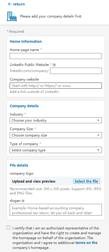 關(guān)于檔案詳細(xì)信息,請(qǐng)確保選擇與品牌一致的徽標(biāo),企業(yè)logo。并要符合LinkedIn的特定大小,即300 x 300像素以及JPG,JPEG或PNG。