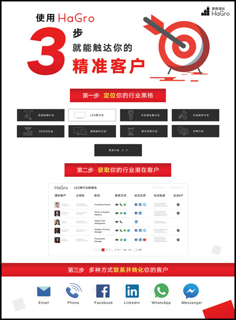 黑格增長(HaGro),以當下最具潛力的社交媒體獲客為基礎,通過AI人工智能挖掘行業(yè)行為大數(shù)據(jù),賦能外貿企業(yè)更簡單、更高效獲取客戶采購線索,將社媒獲客流程中的痛點層層擊破,實現(xiàn)社交平臺紅利裂變式增長,助力外貿獲客輕松實現(xiàn)“黑格增長”!